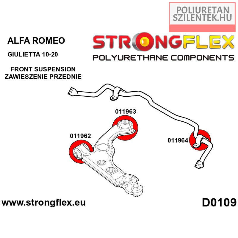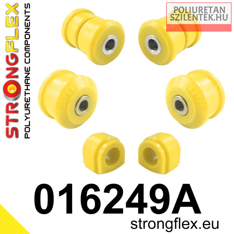 Strongflex első futómű poliuretán szilent készlet, amely tartalmazza az első lengőkar első-hátsó szilentjeit és az első stabilizátor szilenteket.