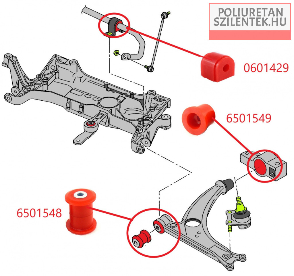 MPBS első futómű poliuretán szilent szett, amely tartalmazza az első lengőkarok elülső-hátsó szilenteket és stabilizátor rúd szilenteket.