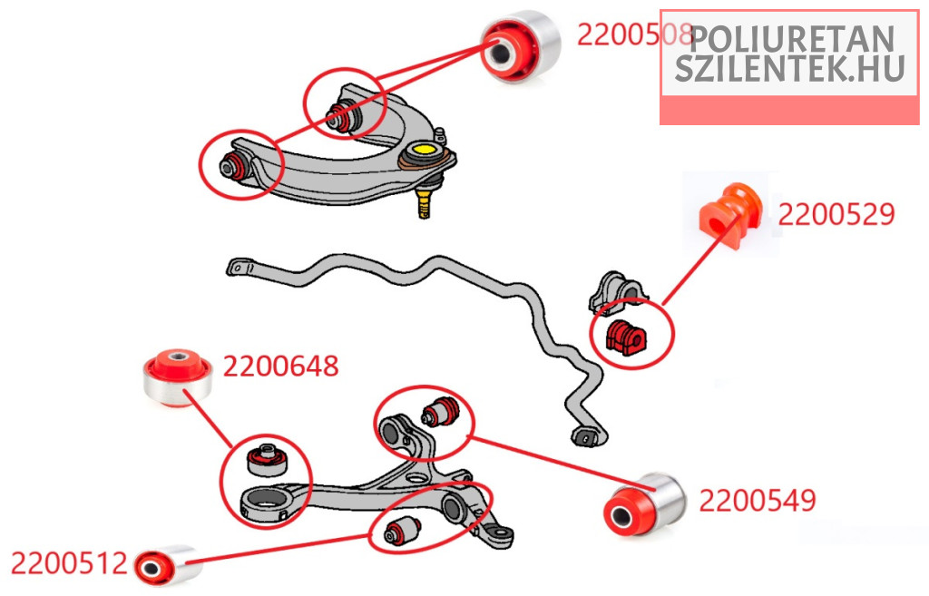 MPBS első futómű poliuretán szilent készlet, amely tartalmazza az első alsó-felső lengőkar szilenteket