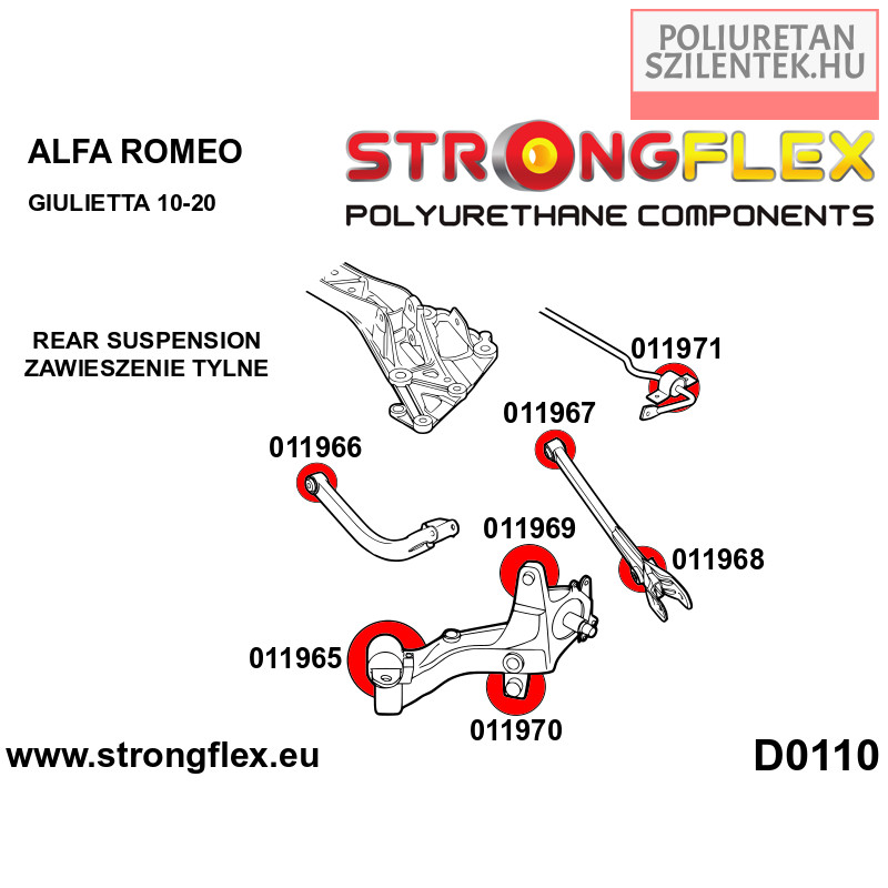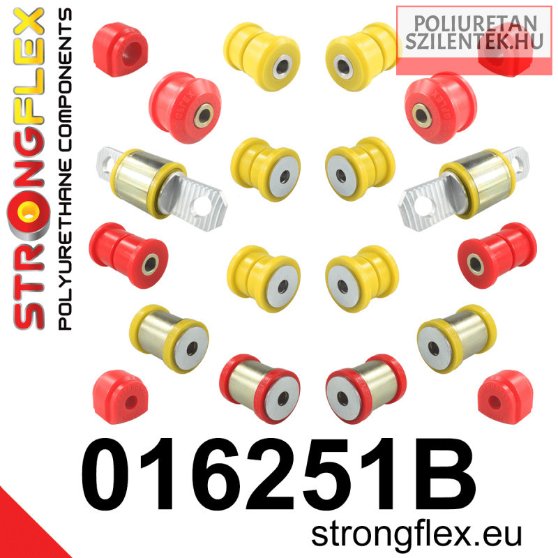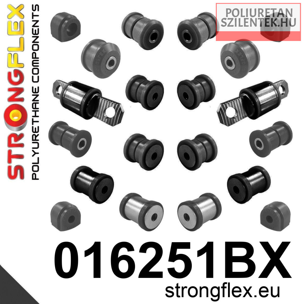 Strongflex komplett futómű poliuretán szilent készlet amely tartalmazza az első lengőkar első-hátsó szilentjeit, első stabilizátor szilenteket és hátsó csonkállvány szilenteket, lengőkar szilenteket illetve a stabilizátor szilenteket.